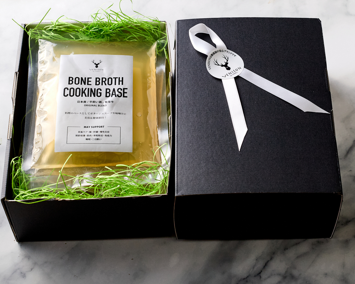 長時間煮込む過程が必須な分、煮出す骨の安全性がとても重要になってきます。VENISONのボーンブロスは、安全な骨をコトコト長時間煮込むことでコラーゲンを多く含む豊富なたんぱく質を引き出し、そして普段の食事に取り入れやすいように控えめな塩味にしています。